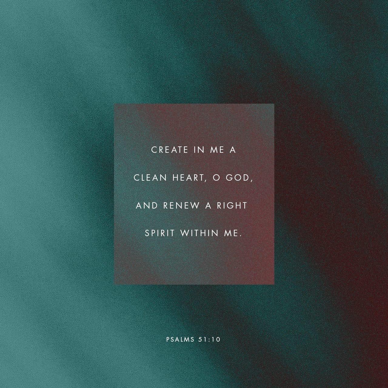 In other versions: “Create in me a pure heart, O God, and renew a steadfast spirit within me.” We sometimes feel helpless to change ourselves, especially in regard to sin. It’s not something we can just force ourselves to do. But God has the power to change and renew us—in fact, He is pleased to transform us into “clean” (holy), pure, righteous, steadfast people—and He will.