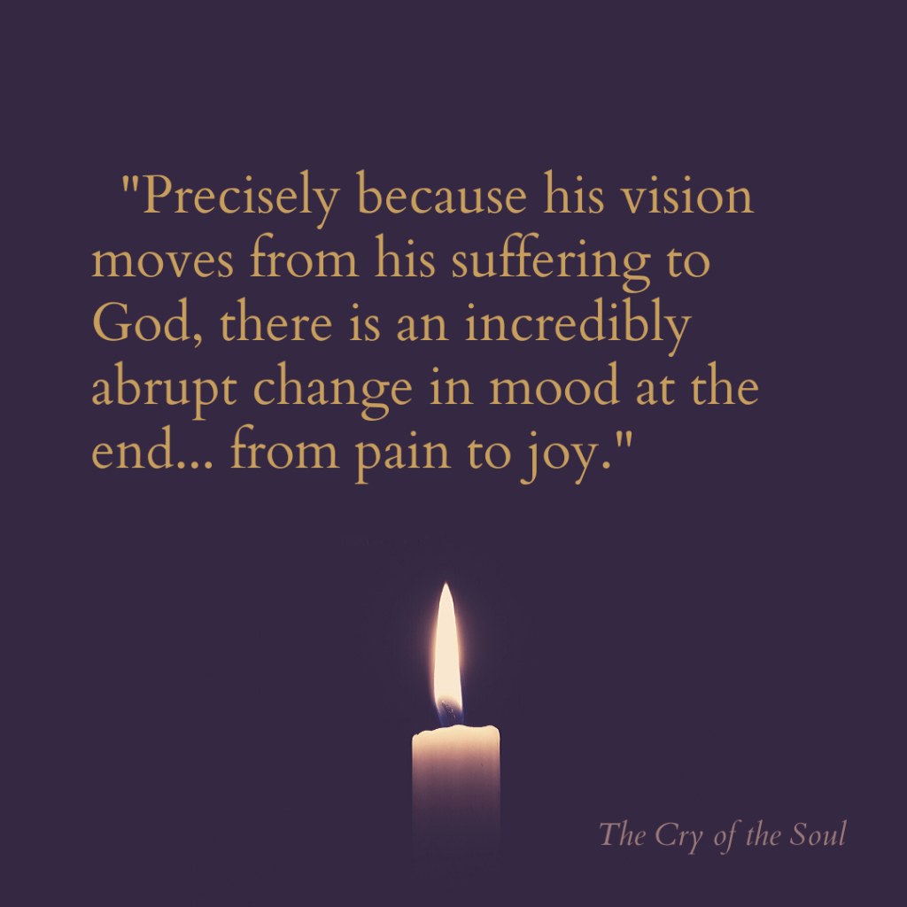 How can we pour out grief, sorrow, disappointment, anger and all the dark things we feel [as the first 29 verses] followed by sincere, confident, thankful praise [verses 30-36]? David goes from drowning to delighting… how?
